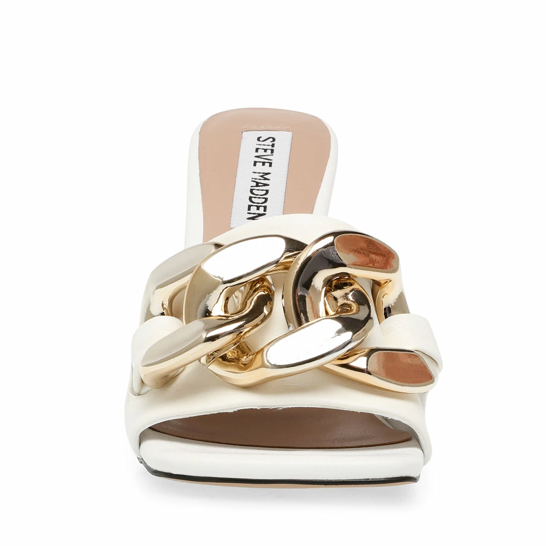 Trim your toes in statement chain! Oversized metal links dress up this sexy slide, while a just-high-enough heel lifts and flatters.