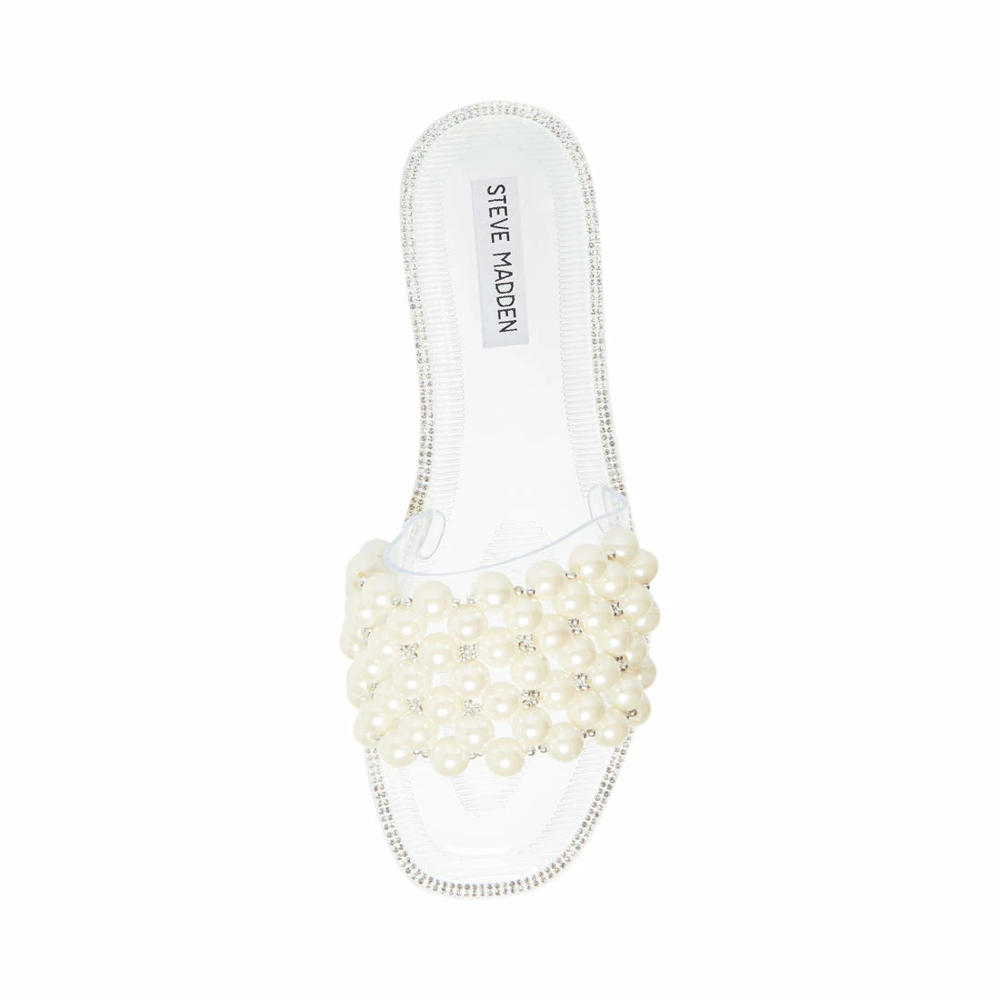 Crafted from clear PVC, blanketed in faux pearls and trimmed in tiny sparkling beads, the JULIET slide is giving us the mermaid queen vibes we deserve.