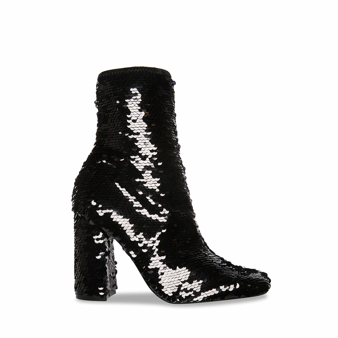 We can thank the glam factory for these show stopping booties. This pair sits on a subtly flared heel with all-over sequins for that burst of metallic we love.