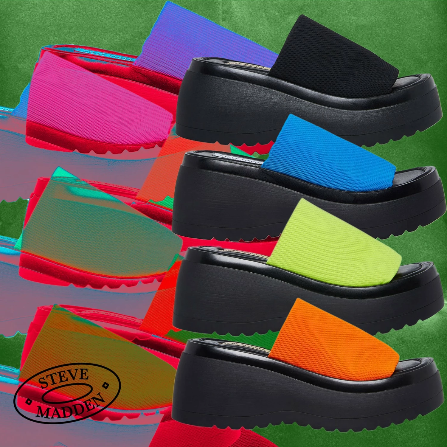 Label loyalists are sure to love SCRUNCHY, as this slideβs stretchy upper and chunky treaded wedge sole make for a style thatβs quintessentially SM! Take your pick between classic black or bright spring colors!