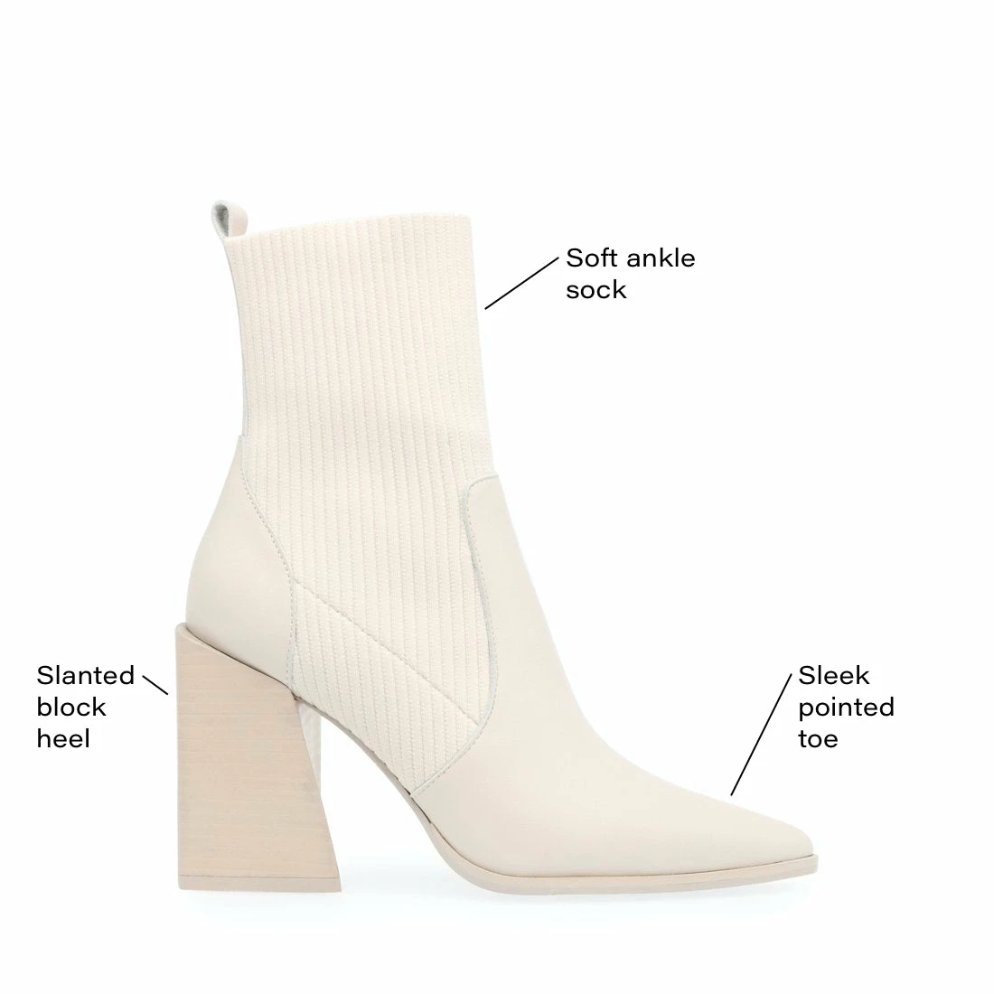 Sharp lines and an avant-garde angular heel give this boot a killer look, while a soft knit shaft allows for easy pull-on entry. A fierce finishing touch for any fashion-lovin’ lady.Â