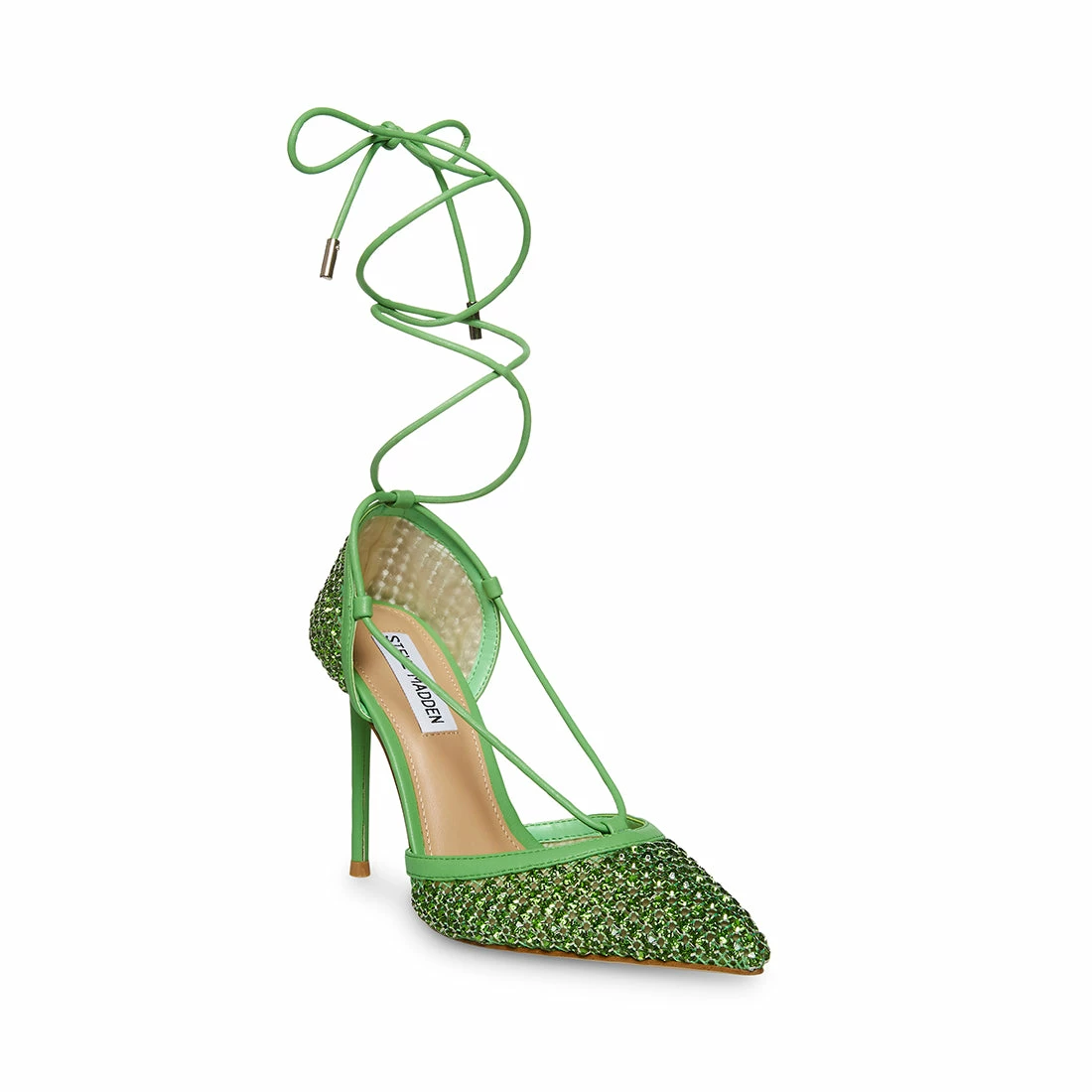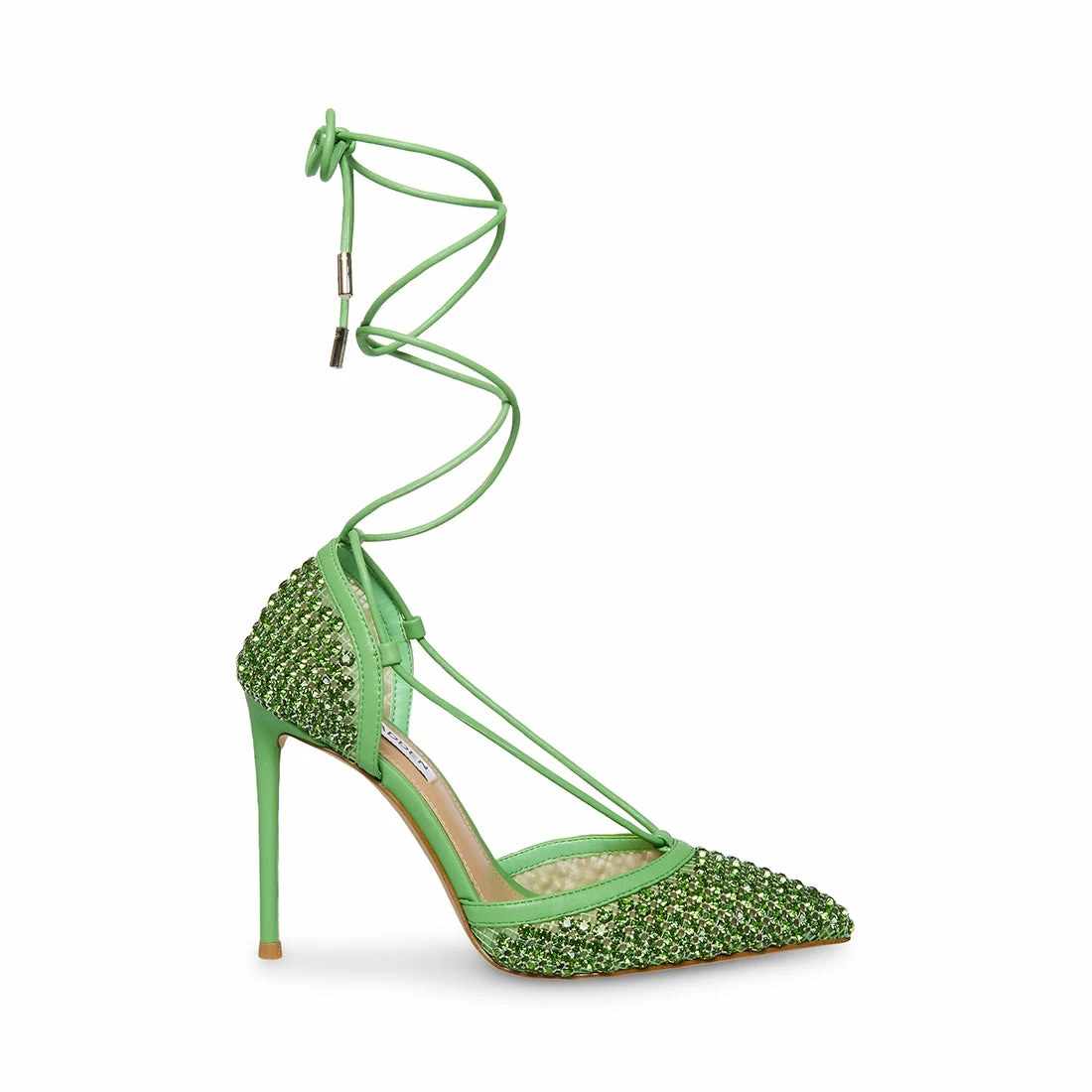 Stun as you strut in VANITY. These rhinestone-covered beauties are all about the bling, featuring a sharp stiletto heel and sexy straps that wrap up your leg.